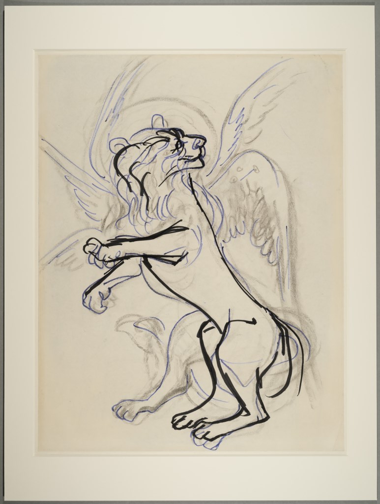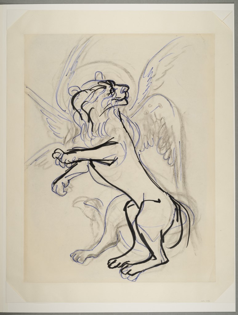 Lion auréolé ailé, dressé, de profil gauche, tête tournée.