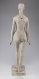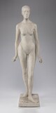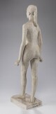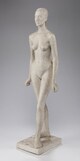 Statue sur socle représentant une jeune femme en pied, nue, la jambe droite avancée, les bras le long du corps et les cheveux attachés en queue de cheval.