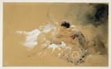 L’attrait de Calbet pour la description de baigneuses est aussi sensible dans une autre aquarelle de la collection d’Henry Vasnier représentant une « Odalisque assise devant une piscine » (907.19.283). Son œuvre manifeste par ailleurs l’intérêt, non dénué de fantasme, de la société et en particulier des artistes pour l’exotisme tout au long du XIXe siècle, une vision européenne bien souvent peuplée d’odalisques lascives. Ses scènes de genre et ses portraits lui assurent la notoriété, et outre ses envois au Salon, il reçoit plusieurs commandes pour la décoration d’édifices dont l’hôtel de ville d’Agen mais aussi d’illustrations d’ouvrages aux thèmes galants comme « Aphrodite » de Pierre Louÿs. [N. Roehrig, 2020]