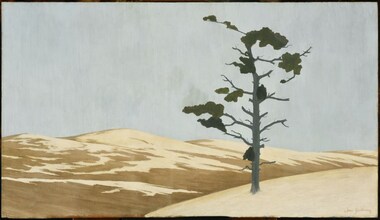 Paysage composé au premier plan d’un parterre de fleurs stylisées, d’une étendue entrecoupée de lignes, de deux habitations et d’arbres stylisés dans le fond.