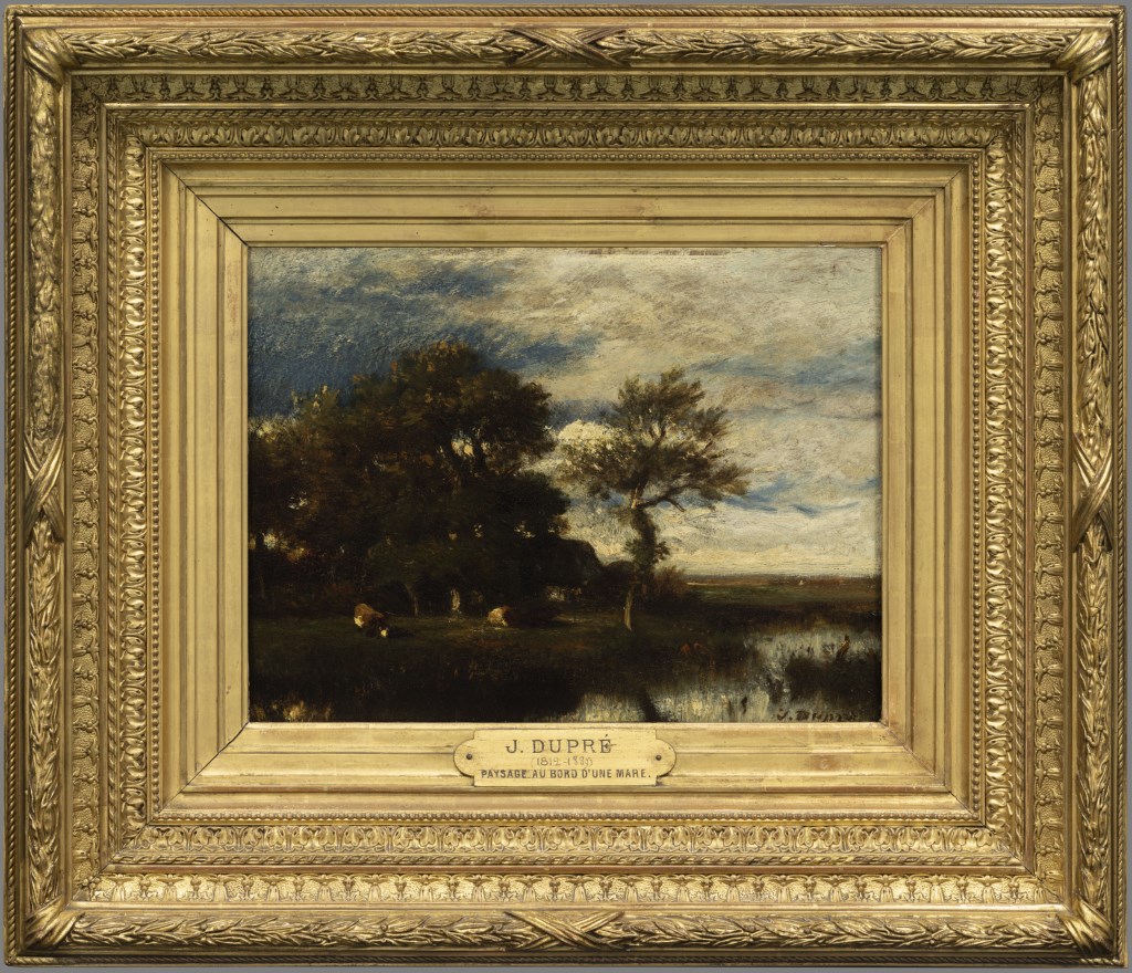 Dans la campagne, trois vaches paissent auprès d’une mare. Blottie dans les arbres, à gauche, se cache une chaumière. Quelques nuages viennent parsemer le ciel bleu. Souvent chez Jules Dupré, nous retrouvons ce thème du point d’eau et du troupeau : « La mare » ; « Vaches au bord de l’eau » ; « L’étang » ; « Bords de rivière » ; « La mare aux chênes » (Paris, musée du Louvre) ; « Vaches à la mare « (Vente Drouot, 25 octobre 1996). Jules Dupré aime travailler la lumière dans des « cieux » nuageux. Il regarde la nature et peint ce qu’il voit, ce qu’il ressent, sans chercher à la transformer. [C. Delot, 1997]