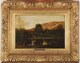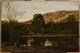 Etang entouré d’arbres ; devant, berger et trois boeufs.