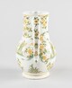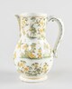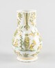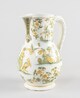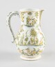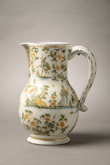 Pichet, petit pied individualisé, assise annulaire, panse ovoïde, col cylindrique, lèvre arrondie par laquelle est ménagé un verseur à pan coupé orné à la naissance d’une coquille rocaille, une anse verticale comportant une perforation ronde destinée à accueillir la charnière (fragment d’un rivet visible) d’un couvercle manquant ; décor à figures dans un paysage exotique avec animaux antrhopomorphes, grotesques et fantastiques ; au centre musicien en pagne, portant cape, coiffe à plume, jouant de la flûte.