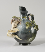 Pichet, pied évasé, panse globulaire, col droit, ouverture à verseur vertical, anse verticale, au décor en relief constitué d’une tête de jeune fille de profil droit, couronnée de feuilles, un drapé sur l’épaule droite, feuilles de laurier grimpant en relief, tige le long de la anse, sur fond en dégradé vert-bleu.