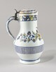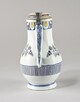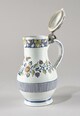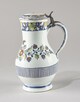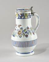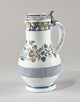 Pichet à pied individualisé légèrement évasé, panse globulaire, haut col cylindrique, lèvre arrondie dans laquelle a été ménagé un verseur, une anse verticale sur laquelle est fixée l’attache de la charnière métallique du couvercle sphérique aplati, au décor consistant en un liseré sur le pied, une frise géométrique de zébrures en milieu de panse, bouquet floral sur la panse, en haut du col frise de fleur et arabesques, spirales sur l’anse, tige florale sur le couvercle cerclé d’un quadrillage.