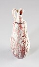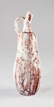 Coloquinte feinte, verseur recourbé, une anse verticale accrochée sur le verseur et en haut de panse, corps godronné ; émail gris moucheté rouge et bleu.