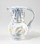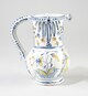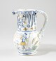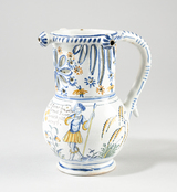 Pichet, pied individualisé, panse globulaire au col cylindrique ajouré en forme de pétales de fleurs et semi de trous ; lèvre arrondie, épaissie, agrémentée de troncs de cône évidés ; anse verticale ; décor de part et d’autre de la panse à tige florale ; au centre, un couple de berger composé à gauche, d’une femme, vêtue d’une robe et d’une tablier, coiffe sur la tête, trois fleurs à la main gauche, quenouille (?) à la main droite, quatre moutons à ses pied ; à droite, d’un homme, de face, chapeauté, la main droite sur le coeur, la gauche tenant une houlette (?) posée au sol ; motif encadré par des liserés sur le pied et le col ; zébrures sur la anse et le bord ; fleurs stylisés autour des jours sur le col.