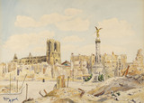 Vue de la place d’Erlon en ruines, avec la fontaine Subé à droite et la cathédrale à l’arrière à gauche.