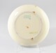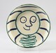 Plat rond, assise plate, au décor polychrome (bleu, vert) figurant un visage souriant stylisé, les mains jointes sous le menton, rayures sur le marli.