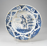 Plat rond, pied annulaire, au décor bleu orné au centre d’un personnage bossu pêchant à la ligne, coiffé d’un chapeau, arbre et végétation, sur le marli, motifs floraux stylisés à lambrequin ; face externe couverte d’un émail ocre.