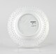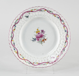 Plat à assise annulaire, lèvre lobée, marli ajouré orné de guirlandes en relief enrichi d’un ruban auquel sont accrochées des fleurs isolées, formant deux noeuds au niveau de deux médaillons en relief enserrant une tige florale ; au centre, grand bouquet.