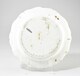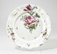 Plat rond, assise plate, bord chantourné, double liseré sous la lèvre, arêtes saillantes, au décor chatironné polychrome (noir, vert, rose, violet, jaune, gris) constitué d’un bouquet floral remontant sur l’aile, deux tiges florales sur l’aile, une fleurette sur l’aile, huit feuilles éparses.