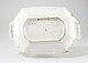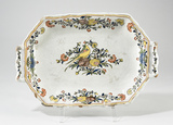 Plat octogonal, assise octogonale, bord chantourné, deux anses horizontales, au décor polychrome (jaune, rouge, bleu, vert, manganèse, noir) figurant un oiseau (mésange ?) avec fleurs et grenades au centre, tiges florales et galon sur l’aile, tige florale sur les anses.