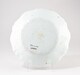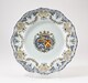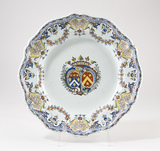 Plat rond, assise plate, bord chantourné au décor polychrome (rouge, jaune, bleu, vert, violet, noir) constitué au centre d’écussons jumelés couronnés accostés de feuillages ; sur le marli, frise florale, guirlandes et lambrequins à damier ; liseré à pétales sur le pourtour.