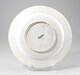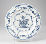 Plat à assise annulaire, marli quasi rectiligne, lèvre arrondie, au décor bleu-blanc sur fond légèrement bleuté consistant au centre en bouquet dans une corbeille, inscrit dans un médaillon et une guirlande polylobée, sur le marli guirlandes florales en frise et lambrequins, double filet sous la lèvre.