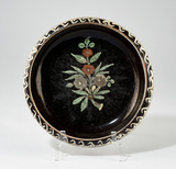 Plat rond, assise plate, lèvre à rebord, au décor polychrome sur fond noir figurant au centre un bouquet floral, torsades sur la lèvre.