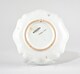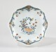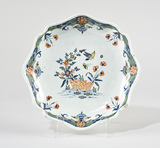Petit plat creux, assise annulaire, bord chantourné, au décor polychrome constitué au centre de haies d’où s’échappent des fleurs, oiseau et papillon, bordure de fleurs et fleurons.
