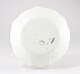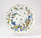 Plat rond, assise plate, bord chantourné, au décor floral circulaire polychrome (rouge, jaune, vert, bleu, violet) constitué d’une double corne d’où émerge des branches fleuries, oiseau, papillons ; liseré à arcades sur le bord.
