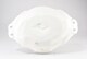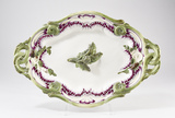 Grand plat ovale rocaille, à assise plate, bord chantourné, ajouré sur les côtés aux motifs de feuillages entrelacés, au centre artichaut en relief, sur les ailes huître et moule d’un côté, de l’autre champignons et poireaux, motifs coquilliers.