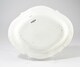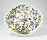 Plat ovale à bord contourné souligné par un filet creux, apointé à quatre reprises, assise plate, au décor couvrant polychrome figurant un oiseau posé sur un arbre bourgeonnant, de profil droit, entouré de deux guirlandes florales, agrémenté d’insectes en vol.