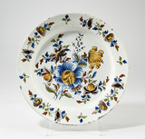 Plat rond, à assise annulaire, marli oblique, au décor polychrome (bleu, vert, jaune, manganèse, rouge) composé au centre d’un bouquet de fleurs, fleurs et tiges alternant sur le marli.