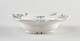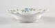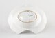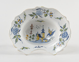 Plat à barbe ovale à assise annulaire, calotte profonde, marli oblique au bord contourné, orné d’un décor polychrome figurant un paysage sinisant duquel émergent au centre des architectures, oiseau et insecte en vol, tiges florales et insectes sur le marli ; assise à double perforation.