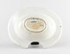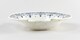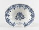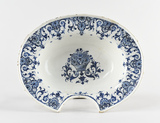 Plat à barbe, assise annulaire, à rebord, au décor en camaïeu de bleu constitué d’un panier floral au fond, frise à lambrequins sur l’aile.