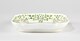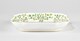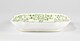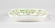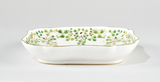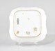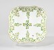 Jatte de forme carrée, assise carrée, au décor de trèfles verts et or, coccinelles en relief, fond blanc ; liseré doré sur la lèvre et l’assise.