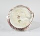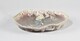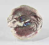 Plat au bord chantourné, aile oblique, du fond duquel émerge en relief une jeune femme quasi de profil, allanguie, en extension, buste puissamment rejetté en arrière, ailée (?), bras gauche ramené dans le bas du dos, le droit contre la tête à la longue chevelure détachée, vêtue d’une longue robe à l’effet drapé mouillé ; émail irisé bordeau et bleu.