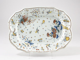Plat ovale, à assise plate, au bord chantourné, décor couvrant dans le goût chinois à la triple haie et à la corne tronquée, fait d’un bouquet de fleurs et fleurs, semis d’insectes et de fleurs isolées, phénix en vol, liseré d’ocelles sous le bord.