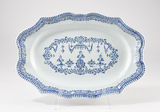 Plat ovale, à assise plate, au bord chantourné souligné par une gorge, décor en camaïeu de bleus dit "à la Berain" consistant au centre en trois bustes féminins encadrant deux corbeilles de fruits celui au centre sur un cartouche surmonté d’un dais duquel pendent des draperies, le tout dans un médaillon ovale fait d’arabesques végétales enrichi de lambrequins, repris sur le bord sous un liseré complété de zébrures.