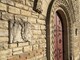 De chaque côté de la porte cloutée aux quatre croix en fleur de lys, en souvenir des sacres royaux, sont placés deux emblèmes : l’agneau pascal et les poissons entrelacés, ou la fécondité. Au-dessus, deux croix grecques et deux croix romaines marquent l’union de l’Orient et de l’Occident [Musée des Beaux-Arts, 2019].