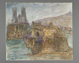 Pont en pierre enjambant une rivière et débouchant sur la berge opposée sur des immeubles et une grande église à deux tours.