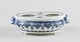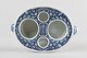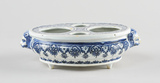 Porte-huilier de forme oblong à trois pieds, à quatre compartiments ovales sur le dessus, à deux anses à tête de lion sur les côtés, panse ventrue, au décor floral stylisé et lambrequin bleu.