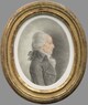 Portrait d’un homme en buste et de profil droit, portant perruque à rouleaux, jabot et veste redingote.