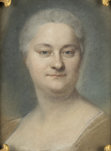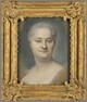 Portrait d’une femme en buste de trois-quarts gauche, la tête de face, les cheveux poudrés, les yeux bleus, esquissant un sourire, et vêtue d’une robe décolletée.