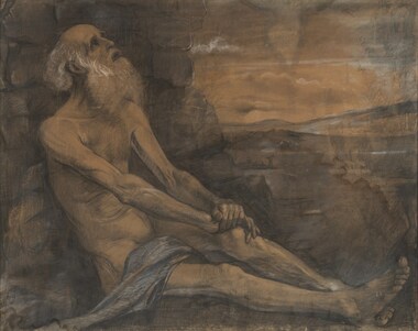 Tête de vieille homme de trois-quarts gauche, barbu, front dégarni, yeux clos.