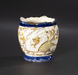 Pot, pied à assise annulaire, lèvre à bord dentelé, au décor polychrome (bleu, jaune, rose, et marron) constitué de branches fleuries et d’un éventail sur lequel figure un poisson en train de nager, liserés bleu au col et au pied.