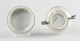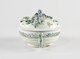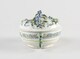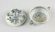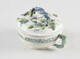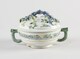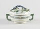 Bouillon rond, hémisphérique, à assise circulaire, paroi à nervures, à deux anses verticales à décor de branche, accrochées sous le bord, décor en face externe consistant en une frise florale soulignée par une ligne de ponctuation reprise à la naissance de la panse ; en face interne, décor identique, au centre médaillon, loup anthropomorphe dans un décor de paysage. Sur le couvercle, anse horizontale consistant en une branche torsadée ; fruits et boutons en reliefs et peints, grappe de raisins.