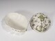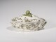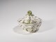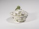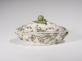 Soupière ovale, de forme chantournée, à petit pied, arêtes scandant la soupière et le couvercle, deux anses horizontales rocailles arrondies formées de deux branches stylisées, munie de son couvercle au frétel en forme de pomme accosté d’un segment de branche (asperge ?), au décor vert floral se développant sur la panse sous un double liseré, ainsi que sur le couvercle sur lequel enrichi de part et d’autre de deux figures, une jeune femme, en pied, de face, tenant son tablier de la main gauche, un jeune homme, de profil, tenant une fleur, main droite levée, coiffé d’un chapeau oriental.
