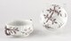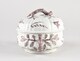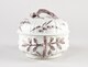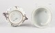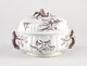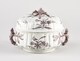 Soupière, petit pied à assise annulaire, panse renflée godronnée, lèvre éversée, deux anses verticales en forme de branche desquelles partent des ramifications sur la panse, tige florale de part et d’autre. Sur le couvercle hémisphérique, godronné, anse horizontale en forme de branche, décor de tige végétale et papillon.