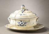 Soupière ovale avec couvercle et son présentoir ; présentoir ovale à assise plate, bord festonné, décor nervuré formant sur le marli des compartiments inégaux aux contours sinueux, tiges et fleurs isolées, décor à la brindille de Chantilly ; soupière à pied individualisé, panse aux renflements formant des registres, deux anses horizontales arrondies, bord évasé, lèvre épaissie, ponctuations sur le pied et les anses, bouquets de part et d’autre de la panse, brindilles isolées ; couvercle de même, renflé en partie supérieure, couronné d’un bouton en forme de fleur à quatre pétales dont un est lacunaire.