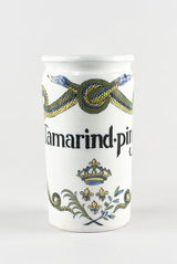 Pot cylindrique, assise plate, lèvre amincie sous laquelle a été ménagée une gorge, au décor consistant en deux serpent entrelacés surmontant un devise et armes de France couronnées entre une palme et une branche d’olivier.