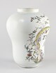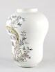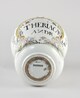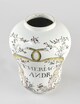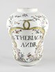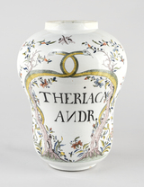 Grand pot à thériaque à assise annulaire, panse renflée en partie supérieure, bord redressé, lèvre arrondie, décor fait de deux serpents enroulés autour d’un arbre fleuri, aux têtes enlacées, encadrant une inscription au centre, surmontés de deux pilons entrecroisés.