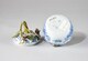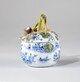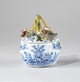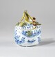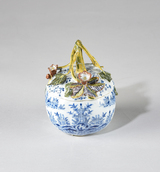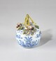 Petit pot couvert, d’allure sphérique, légèrement godronné, assise plate, couvercle garni de branches et de fleurs en relief polychrome retombant sur le corps, au décor en camaïeu bleu d’inspiration orientale figurant rochers, temples et motifs floraux.