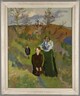 - scène promenade femme agenouillé couronnement fleur enfant paysage végétation nappe d'eau arbre