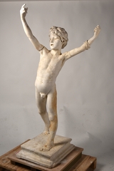 Adolescent nu en position de marche, le tronc incurvé vers l’arrière, les deux bras levés, tenant dans la main gauche une croix avec bandeau.