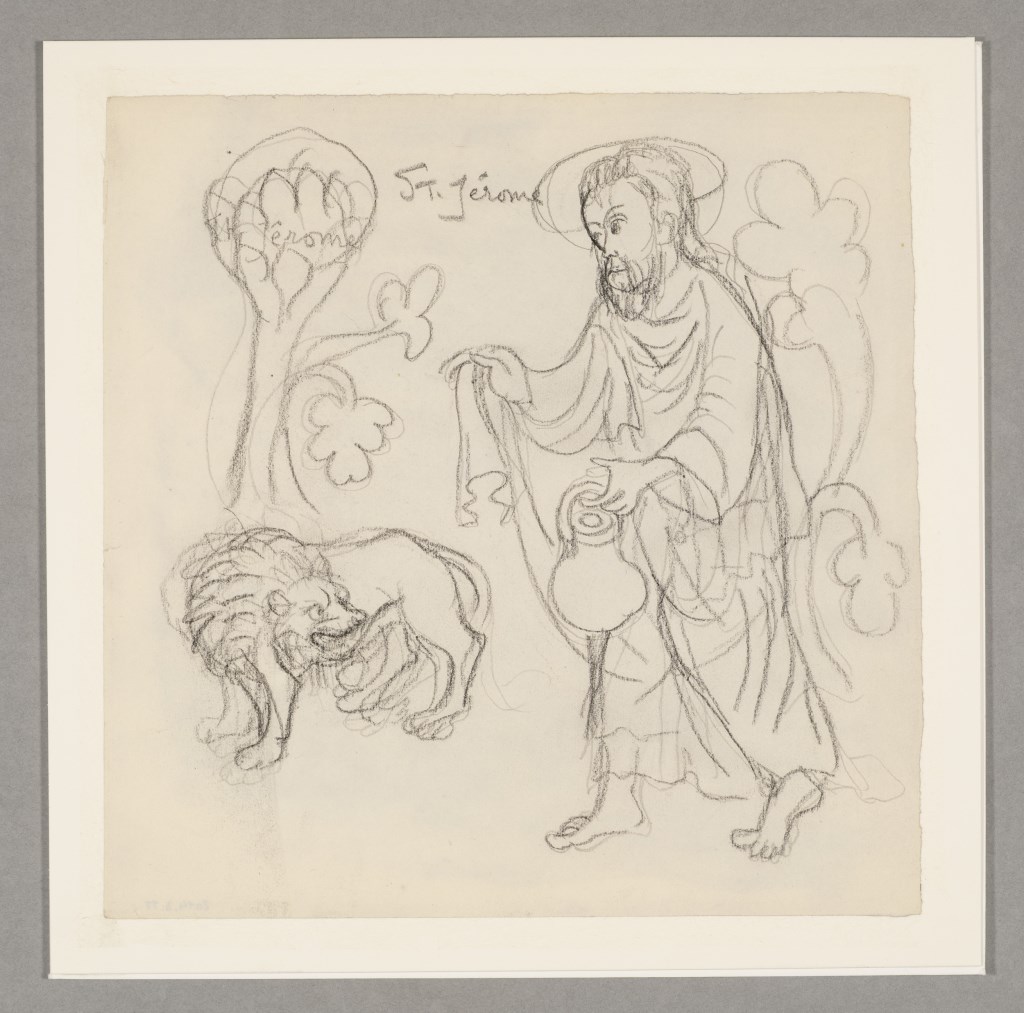 - scène fond de paysage forêt draperie saint Jérôme auréole barbe cruche lion soin