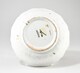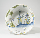 Plat hémisphérique, à assise annulaire, au bord évasé, aux parois cannelées, au décor polychrome consistant au centre en une figure féminine, en pied, de trois-quarts droit, en marche, vêtue d’une robe rayée bleu et jaune, portant corset, ras-de-cou et croix pendentif, voile, tenant à droite contre elle un panier, présentant une fleur de la main gauche, au dessus de laquelle vole un insecte, environnée de plantes sur fond de paysage lacustre ; sous la lèvre, accrochés à un filet, feuilles, fleurs et fougères, second insecte en vol.