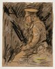 Soldat anglais, assis, de profil gauche, tenant un téléphone de la main gauche et le combiné à l’oreille droite.